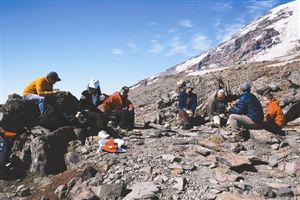 攀登至雷尼尔峰下,登山队员们就地进餐。本版图片由深潜团队提供