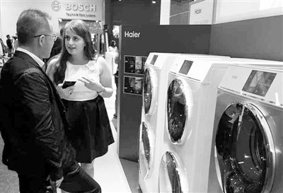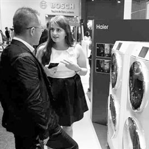 2015柏林国际电子消费品展览会上,工作人员向观众介绍拥有双滚筒的海尔双子云裳洗衣机。经济日报记者 张双 摄