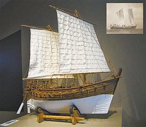 “黑石号”复原船模及其复原画。黑石号沉船出土的唐青花枣椰树叶纹大盘。椰枣古人也称“千年枣”,即今人所说的伊拉克蜜枣。(右下)黑石号出土的唐开元通宝铜钱,中国币制脱离以重量为名的铢两体系,发展为通宝币制,成为唐以后历朝铸币标准沿袭近1300年。(左)