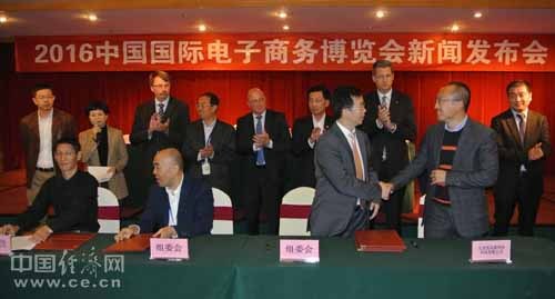 2016中国国际电子商务博览会新闻发布会在京举行,图为企业代表与博览会组委会签订参展协议 中国经济网 记者 吴新竹/摄