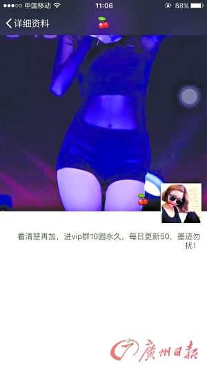 如在“初级群”中,一位昵称为“花姐”的网友发帖称:“视频裸聊一小时内30元,包您满意……”甚至还可以成为“会员”,每天可以视频8分钟。为了证实她自己的真实性,她还发出大量全裸“自拍照”,同时还用语音进行验证。