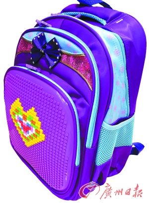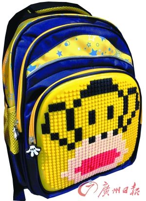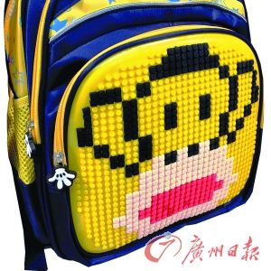 如今,背面可自由变换图案的双肩书包受到不少家长的青睐,书包有着3~4层口袋,外面有防水尼龙布,里面是涤纶里布,书包后面贴着一层柔软的硅胶,上面布满一个个圆形凸起,样子颇似螺丝钉,有赤、橙、黄、绿、青、蓝、紫等多种颜色,每个书包会配送一袋六色中空四方螺帽,学生可根据自己的喜好和想象力,随意拼凑出京剧脸谱、动物图像、字母、飞机、坦克、机器人、卡通公仔、小提琴等不同图案,像是马赛克拼画,不仅漂亮好玩,且想怎么拼就怎么拼,每天都可为书包更换一张不同的脸。