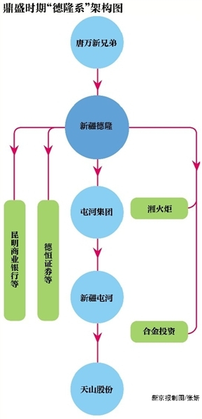 1996年10月,唐万新带领下的德隆受让新疆屯河部分集体股,以第四大股东身份进入屯河,后控制了新疆屯河大股东屯河集团,随后,又通过新疆屯河成功控制天山水泥。2003年,合金投资股权拍卖,唐万新依靠自己的“产业整合”故事“打动”当地政府,成功取得合金投资的股权,并随后将湘火炬也收入囊中。
