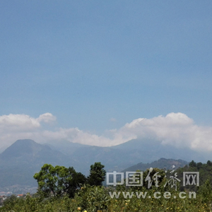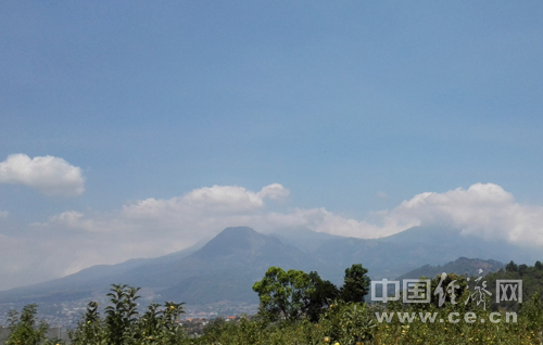 玛琅市郊一苹果采摘园中可遥望远处的活火山—阿朱纳火山,风景十分秀美。中国经济网记者田原 摄