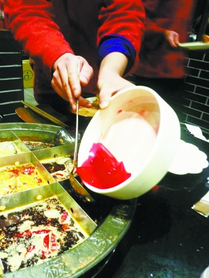 宽板凳的食材非常新鲜,锅底也是鲜红透亮,让人很有食欲。服务员会帮助消费者涮鲜鸭血以及虾滑等菜品。锅底刚端上桌服务员会过来翻搅出锅底的牛油以示所用的锅底为一次性。九宫格的设计免去了消费者满锅捞菜以及剔除花椒等调料的麻烦。但是因为是牛油锅底,筷子上以及料碗里很快就会结一层厚厚的油,会有些许腥味。