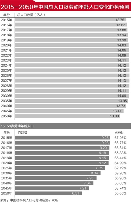 《报告》预测结果显示,2015年中国劳动年龄人口约为9.25亿,2023年开始降至9亿以下,到2050年约为6.51亿;受之影响,其占总人口比例亦明显降低,从今年的近七成,降至2050年的五成。