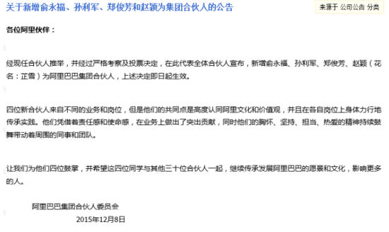 12月8日,阿里巴巴集团(BABA.NYSE)在上市后首次新增四位合伙人:阿里移动事业群总裁及阿里妈妈总裁俞永福、阿里巴巴集团副CFO郑俊芳、蚂蚁金服集团财务与客户资金部总经理赵颖和阿里巴巴农村淘宝总经理孙利军。他们将承担起传承和发展阿里巴巴文化和使命职责。