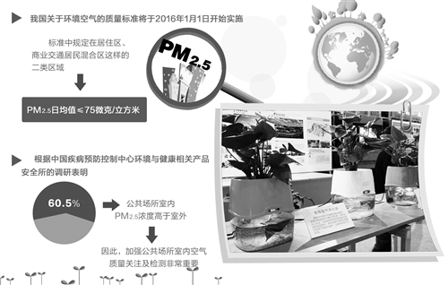 我国关于环境空气的质量标准将于2016年1月1日开始实施,标准中规定在居住区、商业交通居民混合区这样的二类区域,PM2.5日均值≤75μg/m3(微克/立方米)。我国标准制定的前提,是基于日常基数,2013年我国日均PM2.5低于35μg/m3的累积天数只有71天,2014年我国日均PM2.5低于35μg/m3的累积天数有93天。