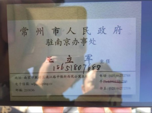 根据淹城公司出具的一张名片,王立军的头衔是“常州市人民政府驻南京办事处主任”,名片上标注了座机、手机号和办公地址。