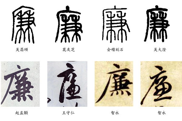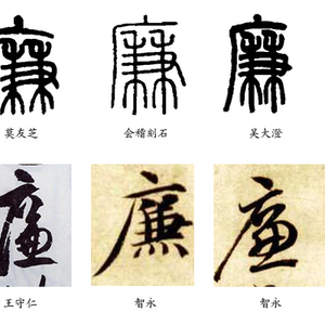 “廉”篆文为,是一个形声字,《说文解字》说“廉,庂也。从广、兼声。”从“广”,即与房屋有关,段玉裁注曰“堂之侧边曰廉,故从广”。在古代,房屋的建筑格局通常是堂室结构,即我们常说的“前堂后室”。堂三面有墙,南面对着庭院而无墙敞开,而廉就是指在堂南面的边角。既然是边角,那么就会有棱有角,因此段玉裁注又曰:“堂边有隅有棱,故曰廉。” 引申为“清也、俭也、严利也。”