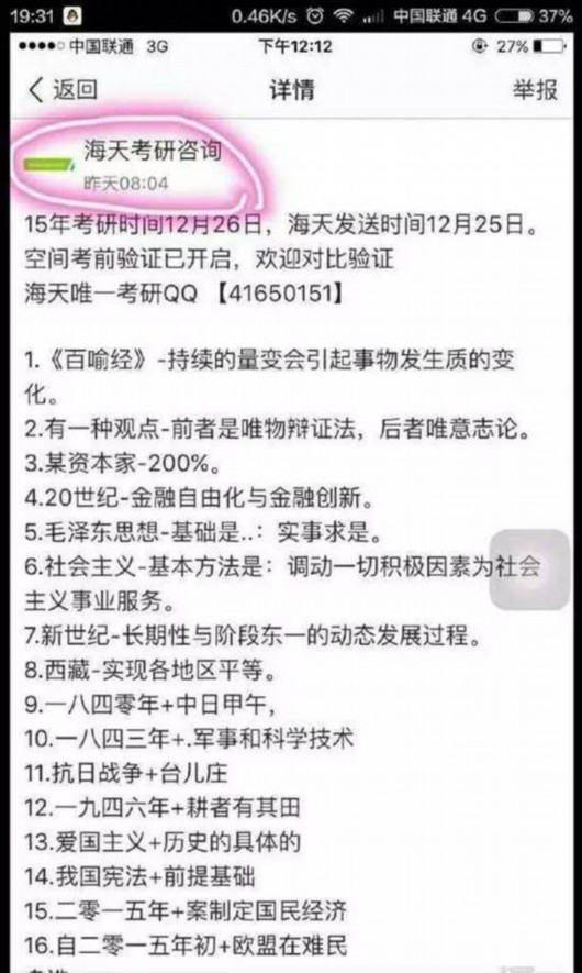 中国青年报·中青在线记者发现,有新浪微博网友曾在27日发布了8张有关“考研泄题”的手机截图: