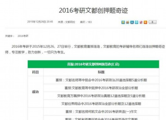 随后,记者联系到了海天考研北京分校的一位李老师。对网上有名为“海天考研”的人在学生QQ群里泄露今年考研真题的事,她回应说:“现在事件比较敏感,现在我也没法给你说太多东西。在文都的官方网站上,“押题奇迹”同样是宣传重点。考试尚未结束,12月26日,文都网站上就出现了以“2016考研文都创押题奇迹”为题的文章。
