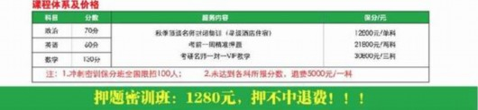 而另一个冲刺密训保分班则声称包380分,这个保分班一个科目的价格就是12800元,并称若未达到分数退费5000块。