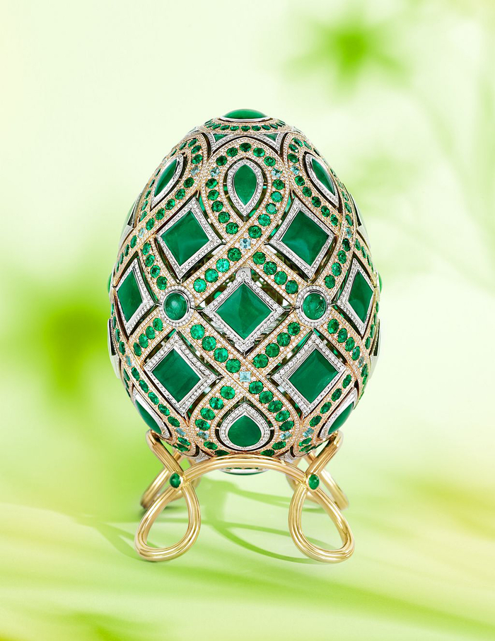 彩蛋镶有重138.36ct的弧面切割祖母绿、36颗公主式切割帕拉伊巴碧玺、5638颗圆形切割钻石,采用18K玫瑰金制作。设计师通过祖母绿浓郁的绿色呈现春日万物复苏的景象。