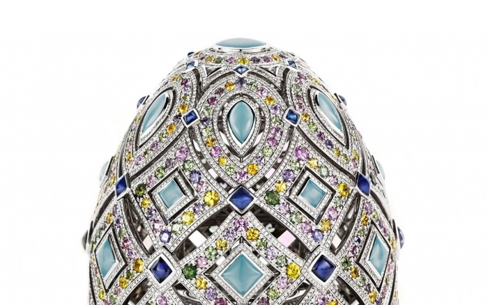 共镶有6720颗彩色蓝宝石和钻石,设计师以圆形、水滴形、四边形为主要设计元素,将其有序排布于彩蛋表面。