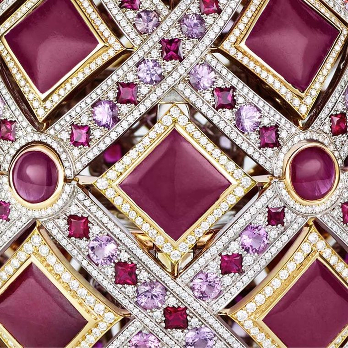 彩蛋以红色为主要色彩基调,以矩形弧面切割为中心,围绕镶嵌玫瑰式切割粉色蓝宝石、以及矩形切割红宝石;最后在交汇处用圆形弧面切割红宝石点缀。