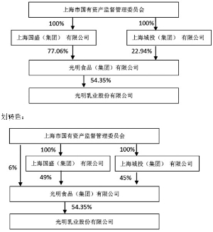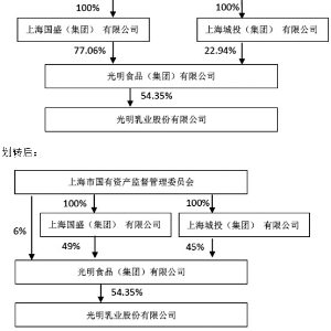 2015年2月16日,本公司收到股东光明食品(集团)有限公司(以下简称"光明食品集团")《关于光明食品(集团)有限公司部分国有股权无偿划转至上海国盛(集团)有限公司的通知》,根据上海国资国企改革的整体部署,为进一步优化资源配置,上海市国有资产监督管理委员会将其所持有的本公司股东光明食品集团54.16%股权无偿划转至上海国盛(集团)有限公司(以下简称"国盛集团")。公司于2015年2月17日发布《光明乳业股份有限公司关于股东光明食品(集团)有限公司部分国有股权无偿划转的提示性公告》(公告编号临2015-005号)。