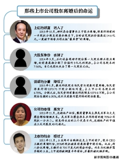 从历史来看,在上市公司股东和高管“婚变”之后,往往带来的就是股价动荡或减持压力。因为,离婚之后,被另一半分走的股权已不在公司股东的控制之中,一旦遭遇表决权、减持或控制权的争端,公司的前景自然也就变得扑朔迷离。