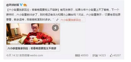 这两天,关于六小龄童央视春晚节目被毙的消息在网上热传,微博话题“六小龄童节目被毙”话题参与数达1.6亿。还有网友说:“零点敲钟时,六小龄童喊一句‘俺老孙来也’,我就能泪奔。”
