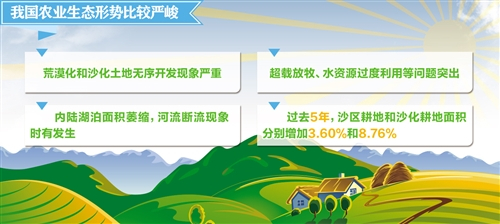 客观地讲,最近几年,为保护农业生态,农业、林业部门做了大量工作,取得了不少成绩,但我国农业生态问题仍较严峻。国家林业局局长张建龙告诉记者,过去10年来,我国荒漠化土地和沙化土地面积自2004年出现缩减以来,已经连续10年保持了双缩减,但是沙区无序开发建设现象严重。沙区开垦、超载放牧、水资源过度开发利用等问题非常突出。过去的5年间,沙区耕地和沙化耕地面积分别增加了3.60%和8.76%。2014年牧区县平均牲畜超载率达到20.6%。与此同时,内陆湖泊面积不断萎缩,河流断流现象时有发生,地下水位也逐年下降。