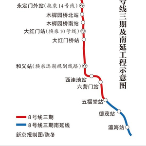 据介绍,8号线三期均为地下线,共设14个车站,其中7座为换乘站。三期南延工程,即从三期终点五福堂站再向南延长3.4公里,沿104国道铺设至大兴瀛海镇,分别设置德茂站及瀛海站。