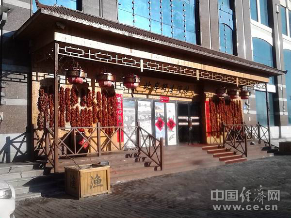 图为北岸野生鱼村门面装修体现浓郁北方民俗。中国经济网记者黄力辉 摄步入厅堂,可见各面墙上张贴着醒目的宣传海报,着重介绍松花江江鱼的品种、口味,以及北岸野生渔村特色主打菜:铁锅炖鳇鱼、山野菜、三烩一焖、农家特色鱼冻。边走边看,记者发现“传统东北火炕、地道东北老味、正宗赫哲做法”是该渔村最拿手的得意之作,已助其稳坐宝地3年之久。