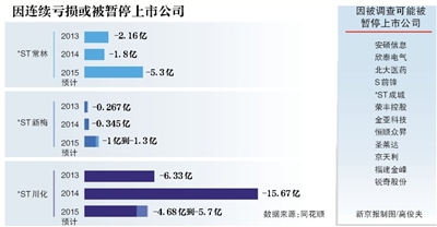 但包括*ST新梅、*ST川化、*ST常林在内的3只ST股票,在连亏两年的基础上,2015年业绩预告仍为亏损,或面临暂停上市风险。