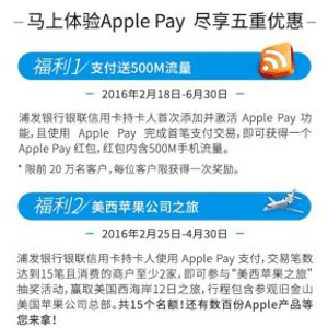 1.2016年2月18日至3月31日,客户在Apple Pay添加我行卡(含信用卡,借记卡),即有机会赢取500MB手机上网流量。4月初,将统一组织抽奖,抽取1000位成功绑卡的客户,各奖励500MB手机上网流量。