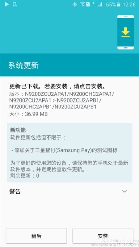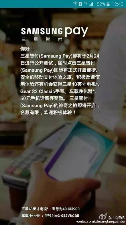 在产品端,三星向来仅跟苹果脚步。Apple Pay正式在国内上线之际,已经有三星手机用户收到了升级推送,截图显示,三星很快就会在国内公测Samsung Pay。