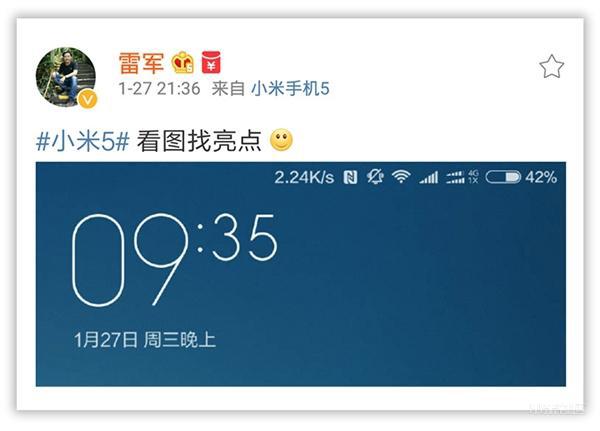 早在1月27日晚,小米董事长雷军就在个人微博发出过“#小米5#看图找亮点”的内容,很多用户都第一时间发现了手机截图上方通知栏中的NFC标识。
