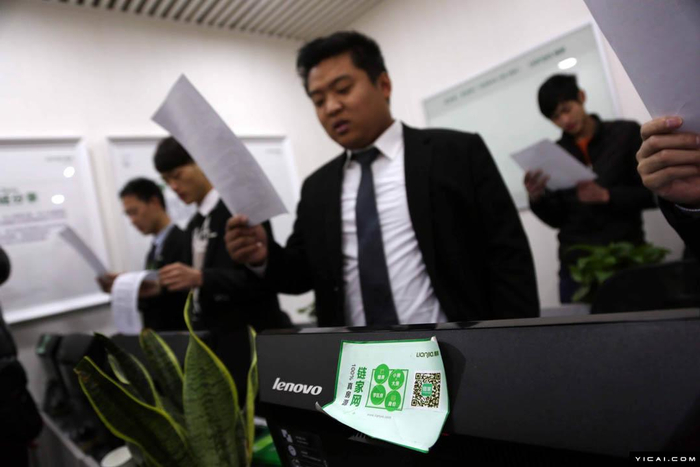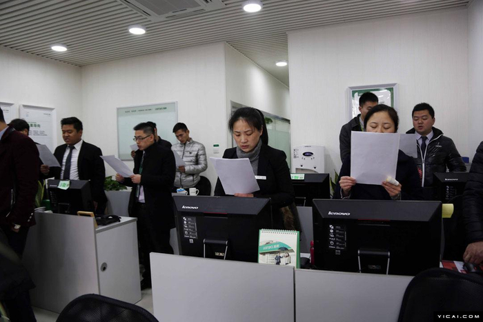 知情人士透露,链家从昨天起所有金融产品都停掉了,还把朋友圈所有关于金融产品的消息删掉了。对此,上述工作人员否认称,链家一直没有提供金融产品,“我们都是带客户到银行贷款的,链家哪来这么多钱。”但记者表示,此前曾有链家中介人员承诺链家可以提供贷款补足不够的房款。该工作人员只是尴尬一笑,没有回答。图为25日清晨,上海浦东一家链接地产,员工在营业部内朗读链家的企业价值观,结束后鼓掌互相打气。