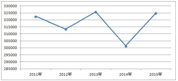 图一:2011-2015年中国茶叶出口量趋势图 单位:吨