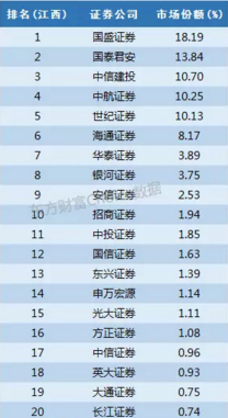 国盛证券是江西本地券商,占据市场份额18%,中航证券和世纪证券同样为本地券商,占据市场份额都为10%左右。