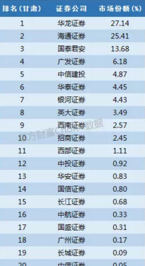 华龙证券是甘肃省人民政府筹建的本地券商,市场份额27%,海通证券由于托管了甘肃证券获得了25%的市场份额。