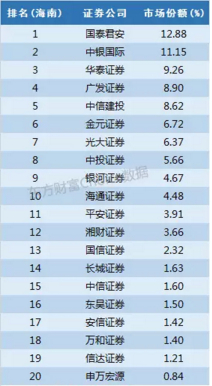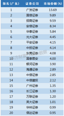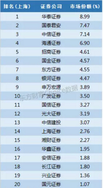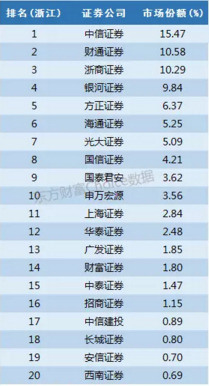 别看中信证券以15.47%的份额排名第一就以为浙江不是本地券商的天下,实际上这里的中信证券是子公司中信证券(浙江),另外两家本地券商财通证券和浙商证券分别也获得了超过10%的市场份额,除此之外,银河证券也有接近10%份额,方正证券、海通证券、光大证券市场份额也超过5%。