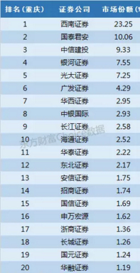 西南证券在重庆本地的实力毋庸置疑,占据市场份额23%,另外国泰君安和中信建投也有不错的表现。