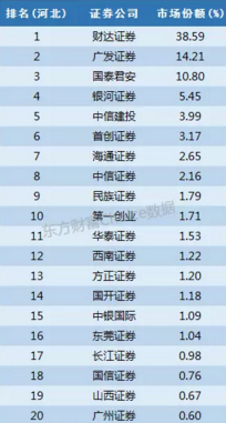 财达证券前身是河北财达证券,本地市场份额38.59%遥遥领先于同行,另外广发证券和国泰君安都有超过10%的份额。