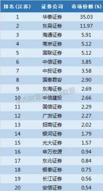 江苏市场由本地券商霸占,其中尤以华泰证券超过35%的份额最为惹眼,其次东吴证券也有近12%的份额引人注目,南京证券、国联证券同样是本地券商分别占据5.12%的份额,前五券商中只有海通证券杀入获取了5.91%的份额是非本地券商。