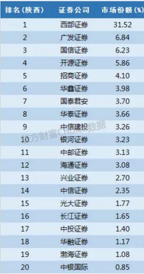 西部证券注册于陕西西安,是本地券商,市场份额超过31%,开源证券同样是陕西本地券商,市场份额为5.86%。