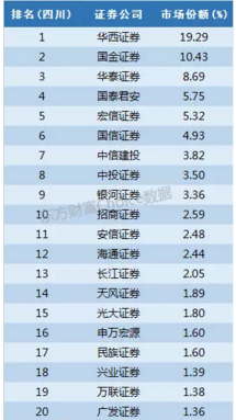 华西证券前身是四川证券,国金证券前身是成都证券,一下子就定义了两家券商在四川的市场地位,华西证券以接近20%的份额排名第一,国金证券以10%左右的份额排名第二。