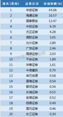 华创证券是贵州省内唯一的国资控股证券公司,市场份额为43%遥遥领先。海通证券和国泰君安在贵州也有不错的份额。