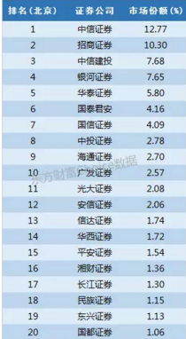 北京的证券市场竞争激烈,并没有具备绝对领先实力的公司,中信证券以12.77%的份额夺得头把交椅,招商证券以10.30%的份额次之,中信建投与银河证券市场份额都超过7%争夺探花之位,华泰证券以5.8%也占据五强席位之一,其余券商份额均未达到5%。