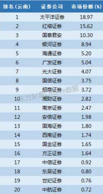 太平洋证券和红塔证券是云南的本地券商,市场份额分别为18.97%和15.62%排名前两位。