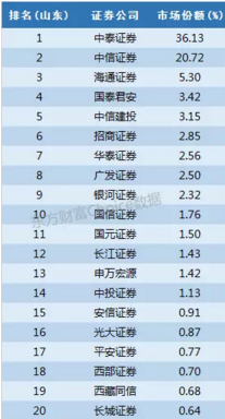 中泰证券前身齐鲁证券,一直是山东的豪强,占据市场份额36%排名第一,另外中信证券(山东),同样可以算作是本地券商,市场份额超过20%。