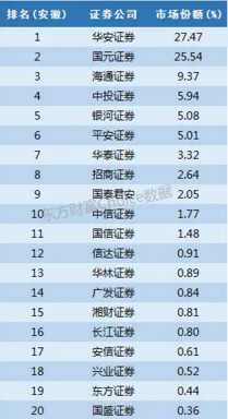 华安证券和国元证券都是安徽本地券商,为两大巨头,分别有27%和25%的市场份额,合计占据半壁江山。