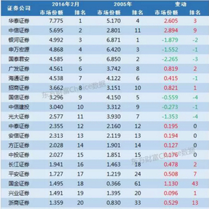 仅以股票经纪业务算,2005年市场三巨头是银河证券、国泰君安、申万宏源,分别占有超过6%的市场份额。十年之后,以2016年2月股票成交金额计算的市场份额,大型券商的排名变动并不大,基本上都属于正常波动;但是表现在份额上,老三巨头份额下降明显,而华泰、中信份额增加较多。中小型券商的市场份额和排名变动则非常明显,特别值得指出的是国金证券和西藏同信证券排名上升幅度明显,都是与互联网深度结合的券商。