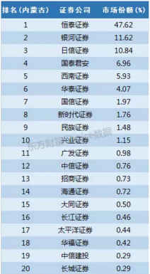 恒泰证券前身为内蒙古证券,如此一说便知它占据47.62%的份额是怎么回事,银河证券占据11%的份额,日信证券同样是内蒙古本地券商,前身为内蒙古日信证券,市场份额超过10%。