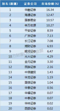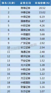 注册在天津滨海新区的渤海证券占据20.52%的份额,华泰证券15%也表现出色,另外中信证券和国泰君安以6%左右的份额可争夺前三。