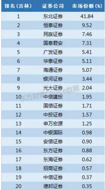 东北证券以前是吉林省证券,现市场份额为41.84%,牢牢掌控第一的位置,值得一提的是大本营在内蒙古的恒泰证券将市场拓展到了吉林,也获取了接近10%的份额排名第二。