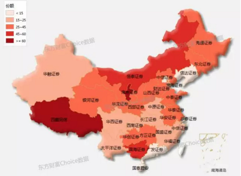 看地图,更直观!各地的龙头券商一览无余,颜色深浅代表龙头券商在该地区的市场份额高低。